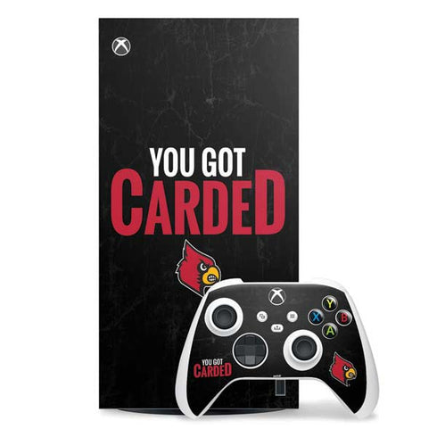 Experience the ultimate way to show off your University of Louisville pride with the You Got Carded design customized on Xbox Series X Skins. This officially licensed skin features the iconic Cardinal logo and vibrant team colors, making it a must-have for any Louisville fan. Not only does it protect your Xbox Series X from scratches and dust, but it also adds a personalized touch to your gaming setup. Made with high-quality vinyl, this skin is easy to apply and remove, leaving no residue behind. Stand out from the crowd and support your favorite team with the University of Louisville You Got Carded Xbox Series X Skin.